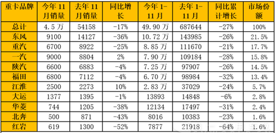累 計來看,1-11月,重卡市場累計銷售49.9萬輛,同比下滑27%,雖然降幅有一點點的縮窄,但仍在-25%以上。東風(fēng)仍然是老大,1-11月累計銷售 重卡10.72萬輛,同比下降26%,跟行業(yè)平均水平相當(dāng),市場份額為21.5%;中國重汽累計銷車8.85萬輛,同比下降21%,低于行業(yè)整體降幅,市 場份額升至17.7%;第三名為一汽集團,累計銷售重卡7.9萬輛,同比下滑28%,降幅也接近行業(yè)平均水平,市場份額為15.8%。