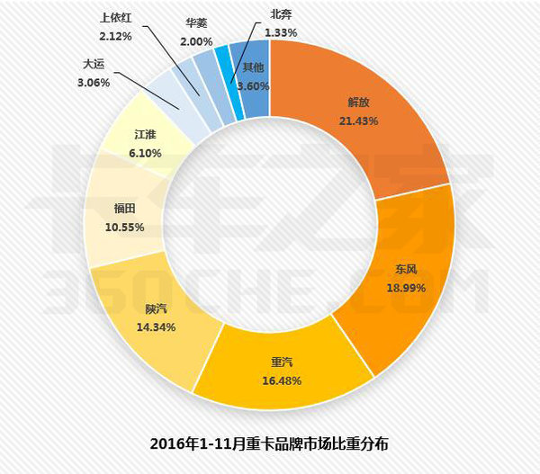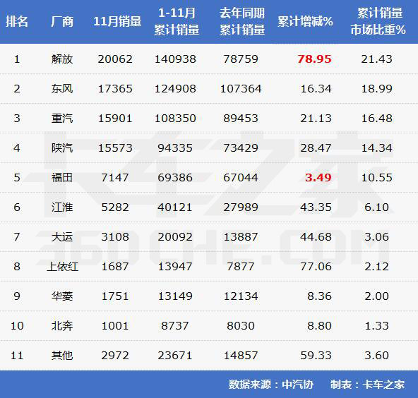 1-11月銷量累計(jì)前5的企業(yè)合計(jì)占去81.80%的重卡市場(chǎng),和上一年的水平基本持平,其中解放今年占21.43%的市場(chǎng)比重,較去年的15.73%,多出近7個(gè)百分點(diǎn),而其他4家則多多少少有些下滑,這也說明了解放的市場(chǎng)今年明顯擴(kuò)大。