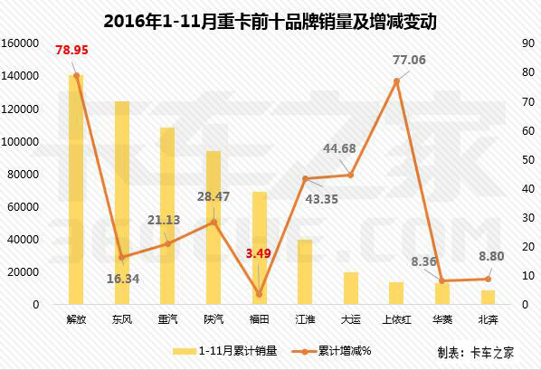 然而,值得注意的是,銷量前10的企業(yè)中4家跑贏了大盤,除解放外,江淮、大運(yùn)、上依紅雖然累計(jì)銷量排名略微靠后,但增長(zhǎng)幅度毫不遜色。相反,銷量第5的福田僅以3.49%的漲幅,排名墊底。