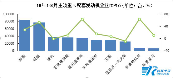 重卡配套動力方面,從2016年1-8月份配套信息來看,配套前三的發(fā)動機企業(yè)分別是濰柴、錫柴和重汽,累計配套量分別為8.51萬輛、7.75萬輛和3.85萬輛,同比增幅分別為30.1%、54.5%和-0.3%。重卡配套前十的發(fā)動機企業(yè)中,福田康明斯和菲亞特紅巖同比增幅均超過60%,增幅較大;道依茨一汽大柴同比下降7.7%,降幅最大。