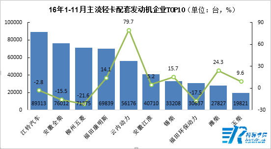輕卡配套動(dòng)力方面,從2016年1-11月份配套信息來(lái)看,配套前三的發(fā)動(dòng)機(jī)企業(yè)分別是江鈴汽車(chē)、安徽全柴和柳州五菱,配套量分別為8.93萬(wàn)臺(tái)、7.6萬(wàn)臺(tái)和7.14萬(wàn)臺(tái),同比降幅分別為-2.8%、-15.5%和-21.6%。輕卡配套前十的發(fā)動(dòng)機(jī)企業(yè)中,云內(nèi)動(dòng)力同比增長(zhǎng)79.7%,增幅最大;柳州五菱同比下降21.6%,降幅最大。
